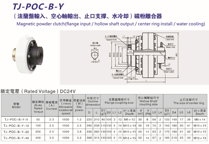 天機牌帶機座水冷式磁粉離合器TJ-POC-Y的安裝尺寸和具體型號參數如下:
